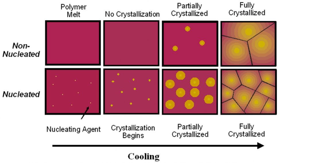 温度过高,成核剂中低分子量的物质会产生分解和挥发,减少了成核剂中有效成分,降低了透明度的改善效果,且较高温度,会破坏PP中原有的晶核,减少了异相成核中心,致使改性效果降低;而温度过低,成核剂的分散性就不好,透明性效果则差。所以,选择一个合适的成型温度对改善透明性显得尤为重要。