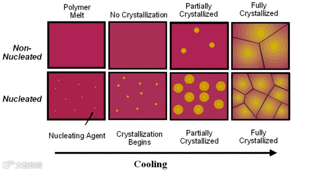 就山梨醇而言,成核剂用量超过0.3%后,透明度改进效果不明显,甚至会有所下降;但用量低于0.2%时,成核数量不足,透明度增加不够。由此可知,成核剂用量最好在0.2-0.3%之间。所以,合适的成核剂含量能更好的改善PP的透明性。