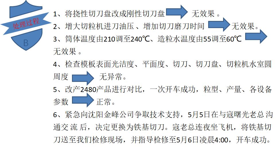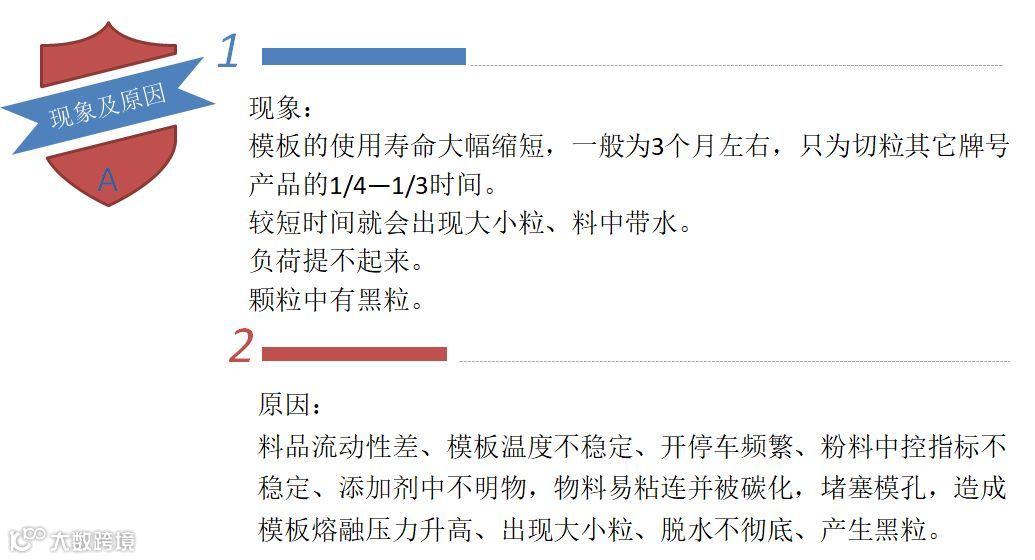 1、2017年9月底,造粒A线连续多次出现垫刀。多方查找原因均未有明确的、合适的答案。此过程中熔融压力正常、粒料形状正常未有拖尾、模板表面及其平面度均无异常,但更换模板后垫刀现象消除。