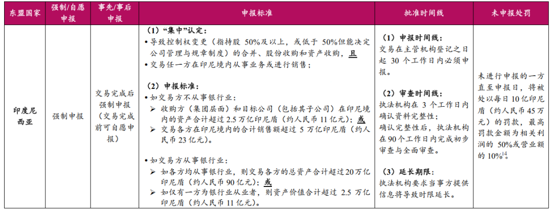 目前东盟多数司法辖区基本遵循“集中+达到申报标准”这个大框架以判断交易是否触发申报义务,但“集中”认定标准、申报标准、豁免申报的标准等具体要求仍差别较大,例如印度尼西亚规定交易应具备“本地联系”才构成集中,各司法辖区的申报标准包括营业额/市场份额/资产价值/交易价值等。