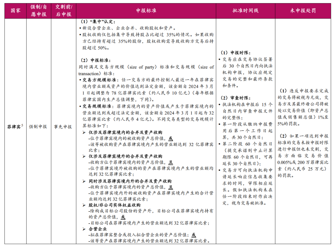 在迟延申报处罚案例方面,中国某电子产品ODM制造商收购某荷兰半导体供应商(在菲律宾境内有子公司)的交易在协议签署后的194天才进行申报,双方被罚款716,150菲律宾比索(约人民币88,534元)10。