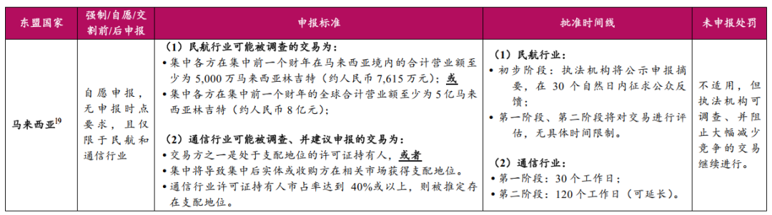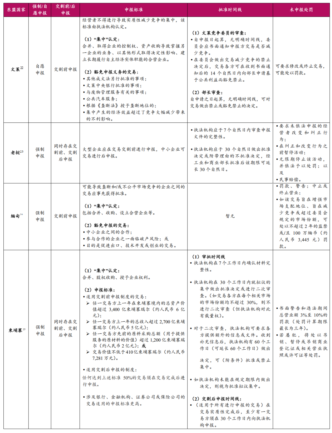 我国仅要求交易在实施前需要进行申报并获得批准,东盟某些司法辖区可能对时间有额外、更严格的限制,例如菲律宾要求签署交易协议后的30个自然日内进行申报,柬埔寨要求交易实施后也要在30个工作日内向执法机关报告交易状态。