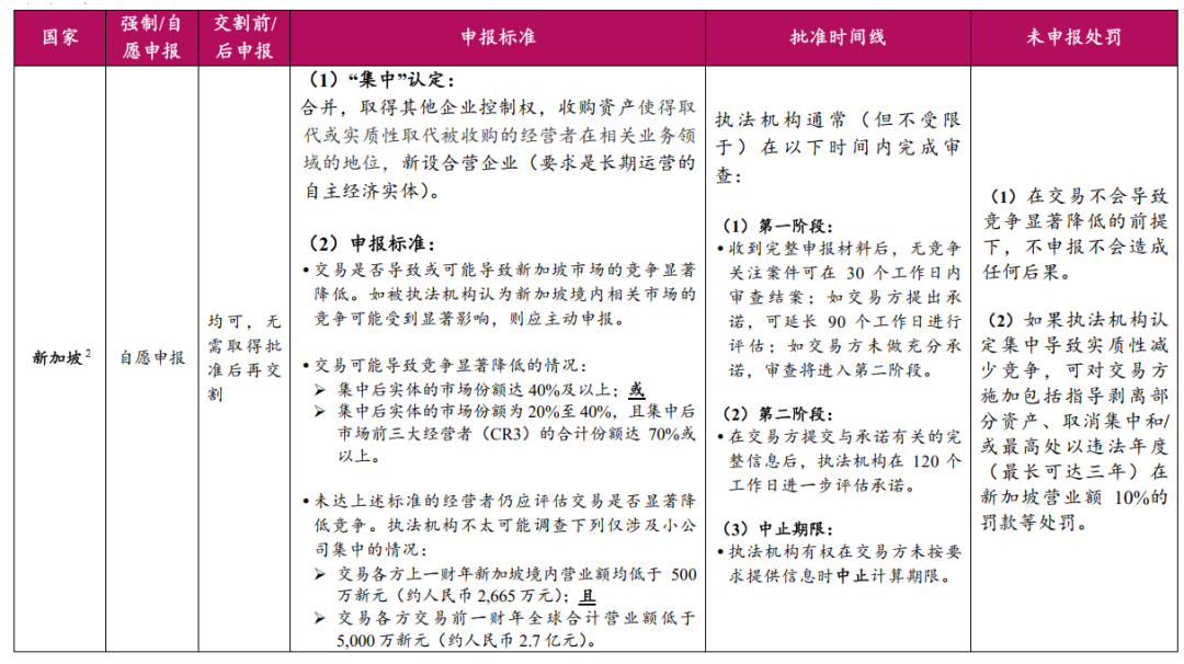 未依法申报处罚案例:2018年Grab收购Uber东南亚业务,该交易未在新加坡进行经营者集中申报,执法机构对交易双方分别处以650万新元(约人民币3,467万元)的罚款及限制交易方行为的指令4。