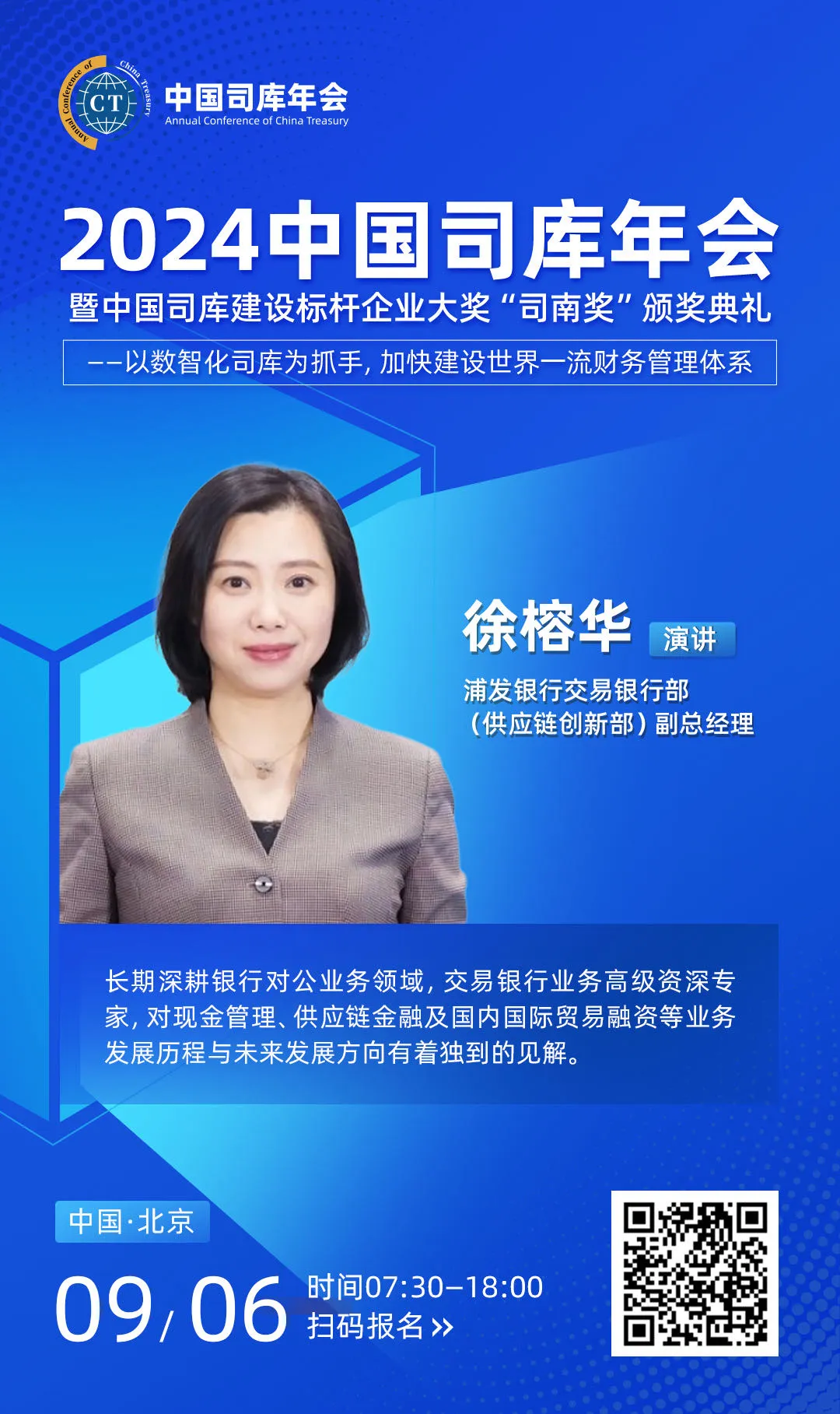 本次年会,徐榕华女士将围绕“共情共生,北斗司库传递浦发的温度与智慧”这一主题,深入剖析司库管理体系在数字经济时代的重要性,分享浦发银行在司库服务领域的创新实践与成功经验。她将从政策导向、市场需求、技术应用等多个维度出发,阐述如何通过数智化手段构建高效、智能的司库管理体系,为企业财务管理带来革命性变革。