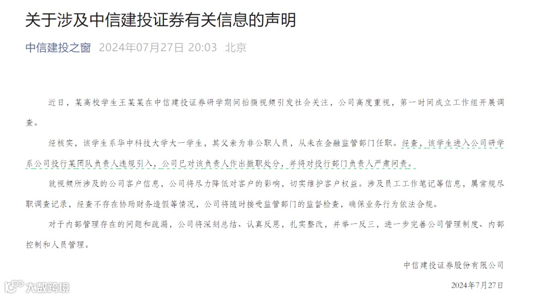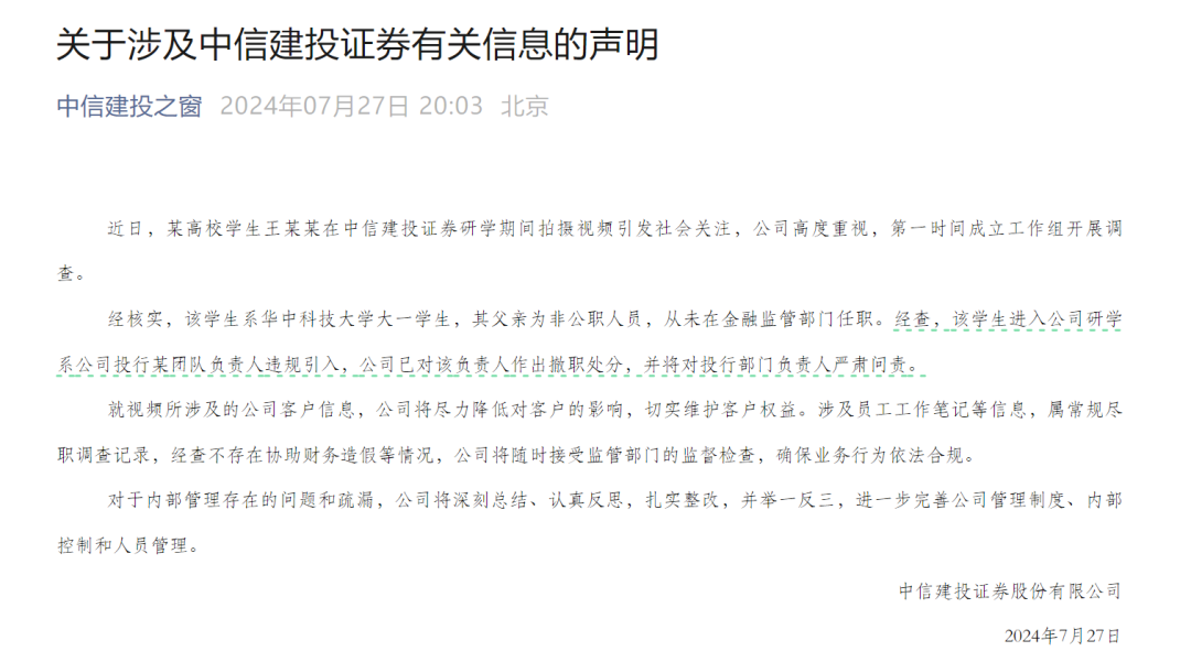 7月27日,中信建投在最新声明中称,经核实,该学生系华中科技大学大一学生,其父亲为非公职人员,从未在金融监管部门任职。经查,该学生进入中信建投研学系公司投行某团队负责人违规引入,中信建投已对该负责人作出撤职处分,并将对投行部门负责人严肃问责。