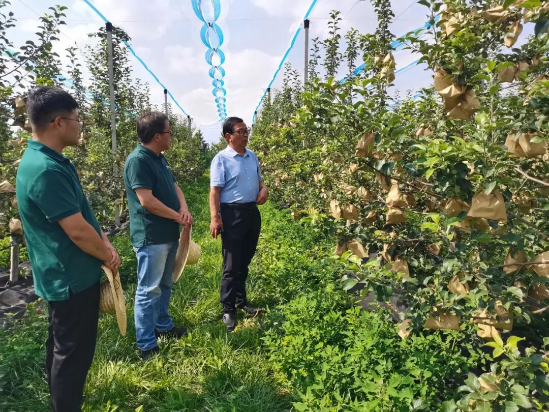 马锋旺(右一)在陕西北帝虹光现代农业有限公司种植基地查看苹果长势。