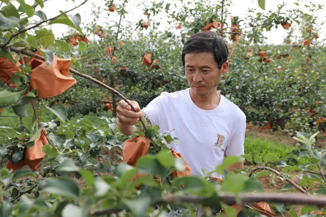果农崔卫东在果园查看秦脆苹果生长情况。