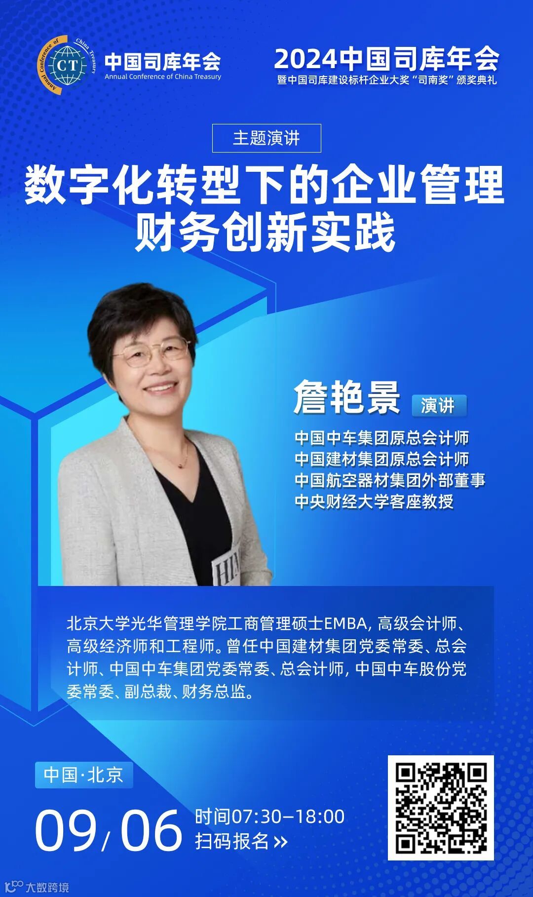 此次,詹艳景女士确认出席2024中国司库年会,不仅是对大会的高度认可与支持,更是对数智化司库建设未来发展的期许与鼓励。在年会期间,詹艳景女士将参与主题演讲环节,分享她在财务管理与司库建设方面的宝贵经验与深刻见解,为与会者带来一场思想盛宴。
