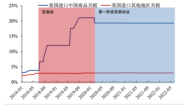 拜登政府时期基本仍延续前任的关税政策。数据显示2018年至今,美国对华平均关税增长近6倍,中国对美出口商品中约2/3被加征关税,美国对进口中国商品平均征收19.3%的关税,而其他地区贸易加权平均关税仅约3%。