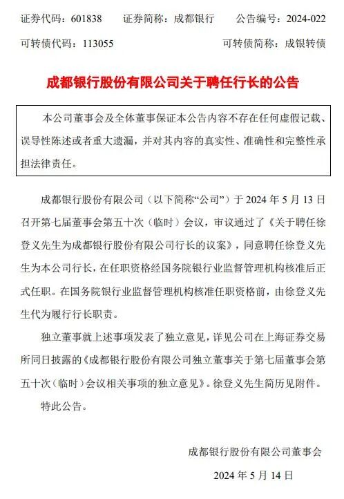 5月13日晚间,成都银行公告称,经董事会审议通过,该行聘任徐登义为新任行长。