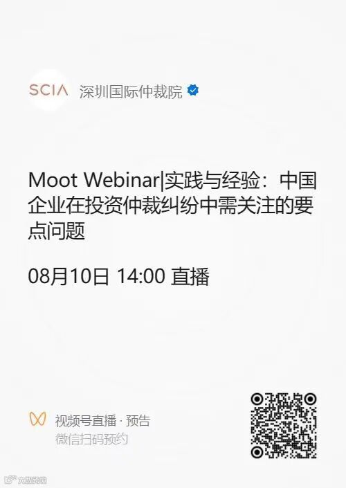 本次活动将通过深圳国际仲裁院的视频号进行直播,欢迎扫码点击“预约”按钮关注参与。