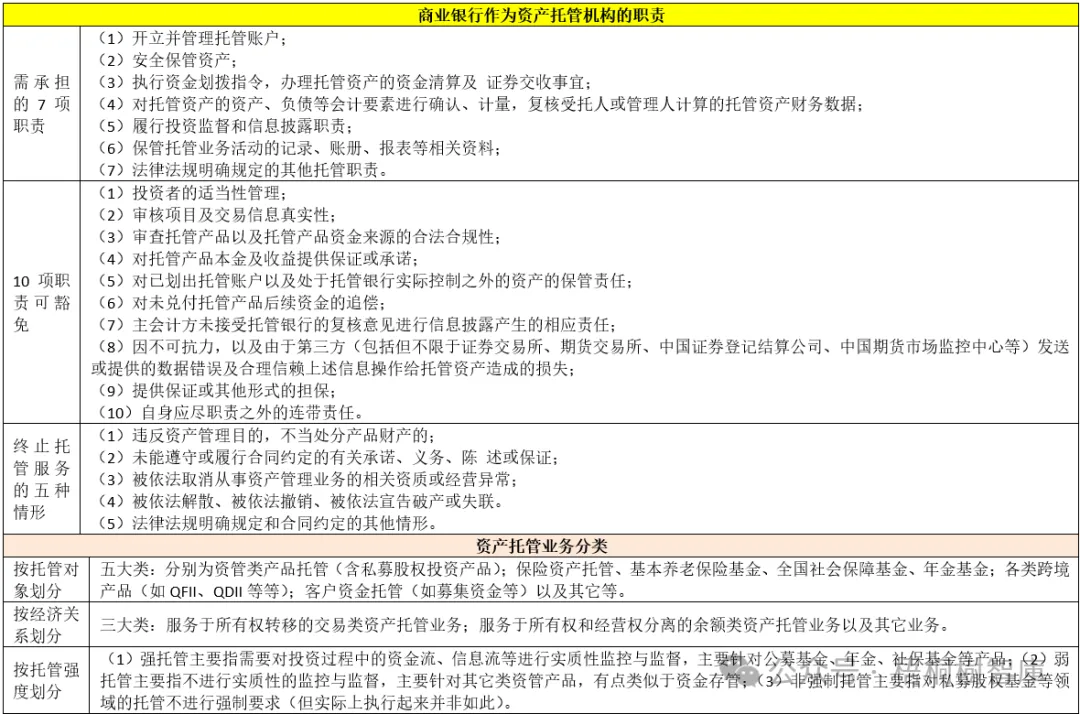 商业银行资产托管业务最初主要指公募基金托管,随后业务范围与作业对象不断延伸,目前除公募基金外,对各类资管细分行业资金、保险与养老资金、三方资金监管、QFLP与QDLP资金等等进行托管也属此列,这也是为什么商业银行资产托管业务规模要远远超过公募基金规模的原因。不过公募基金托管仍是商业银行资产托管业务的基础与核心,其它托管或类托管业务(如存管、监管等)基本均以公募基金托管为基准。