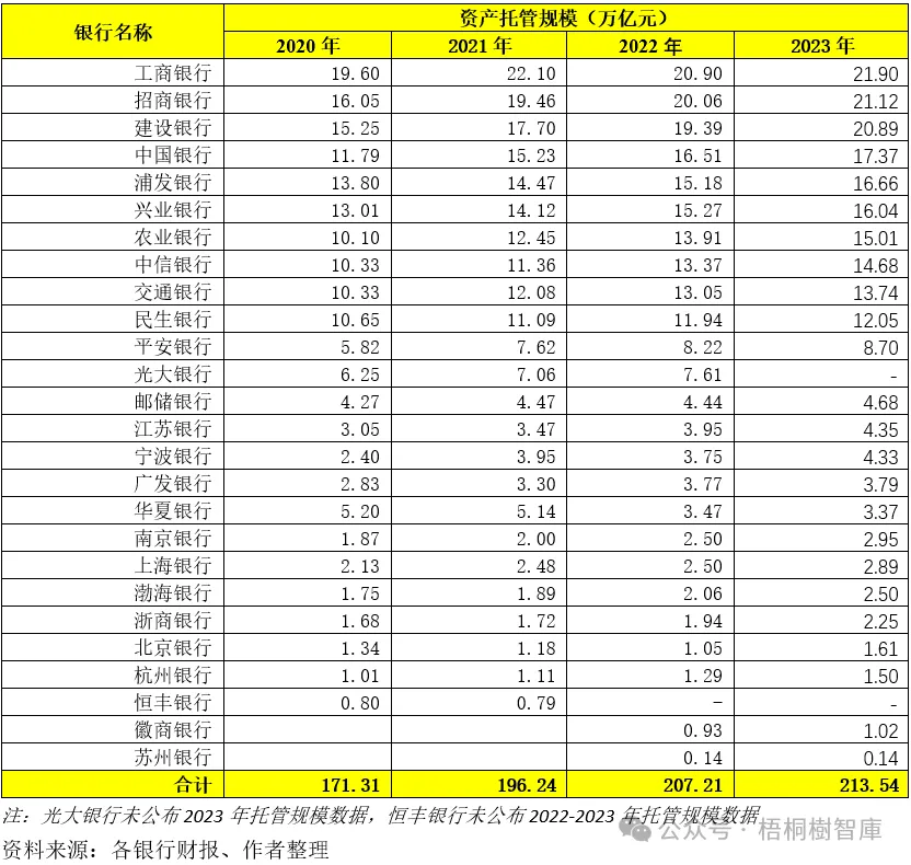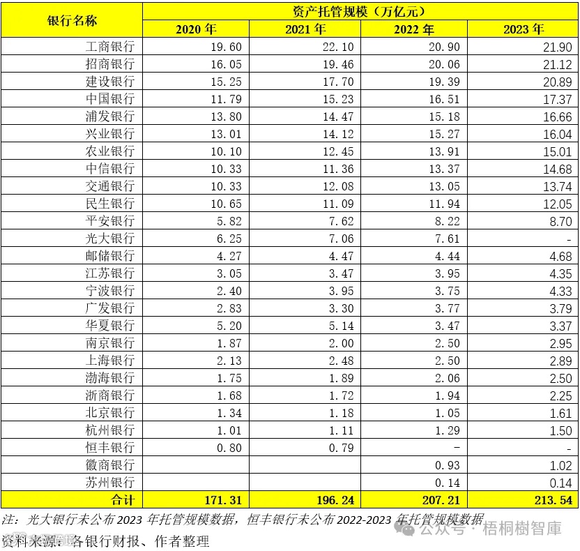 根据统计,有24家银行披露了2023年托管规模数据,2024年托管规模合计达到213.54万亿,如果加上光大银行(预计在8万亿左右),则意味着托管规模将会超过210万亿。