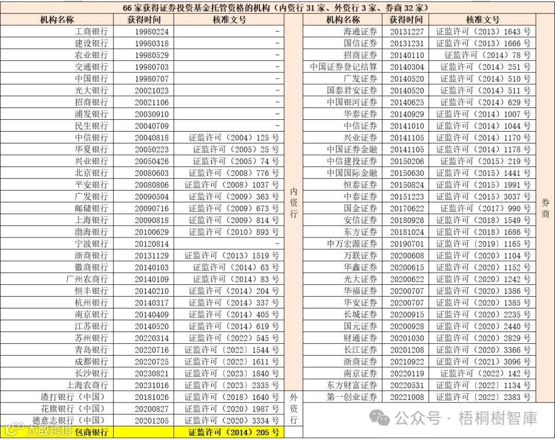 1、根据证监会公开的信息,目前已有66家机构获得基金托管牌照,具体包括31家内资行、3家外资行与32家券商。其中,
