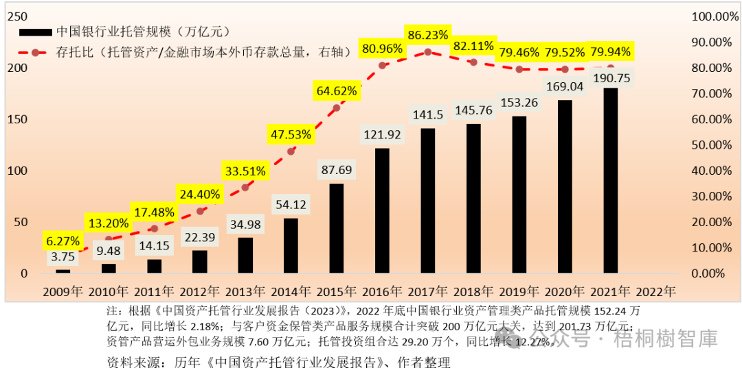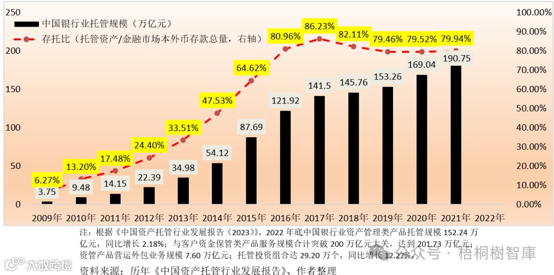 (一)整体情况:商业银行托管规模合计超过210万亿,存托比约为80%