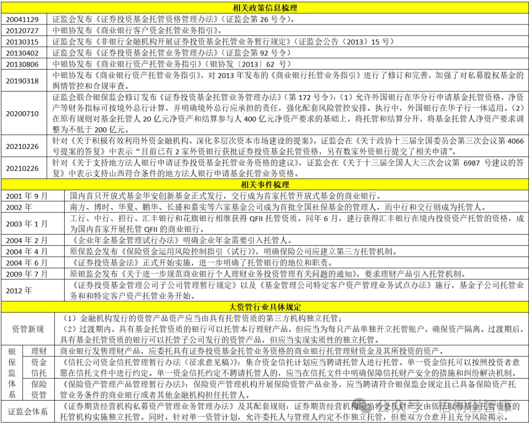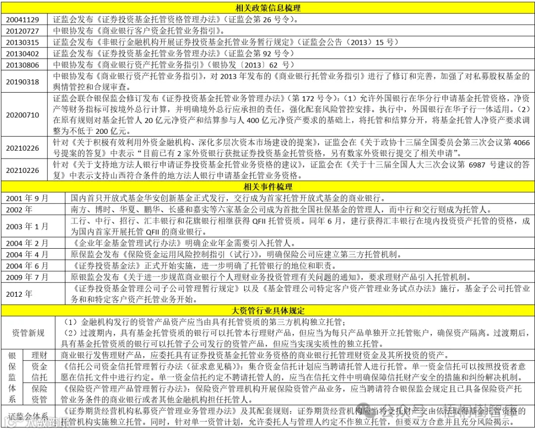 (1)2013年3月,证监会发布《非银行金融机构开展证券投资基金托管业务暂行规定》(证监会公告(2013)15号),明确券商等非银行金融机构可以申请公募基金托管牌照。