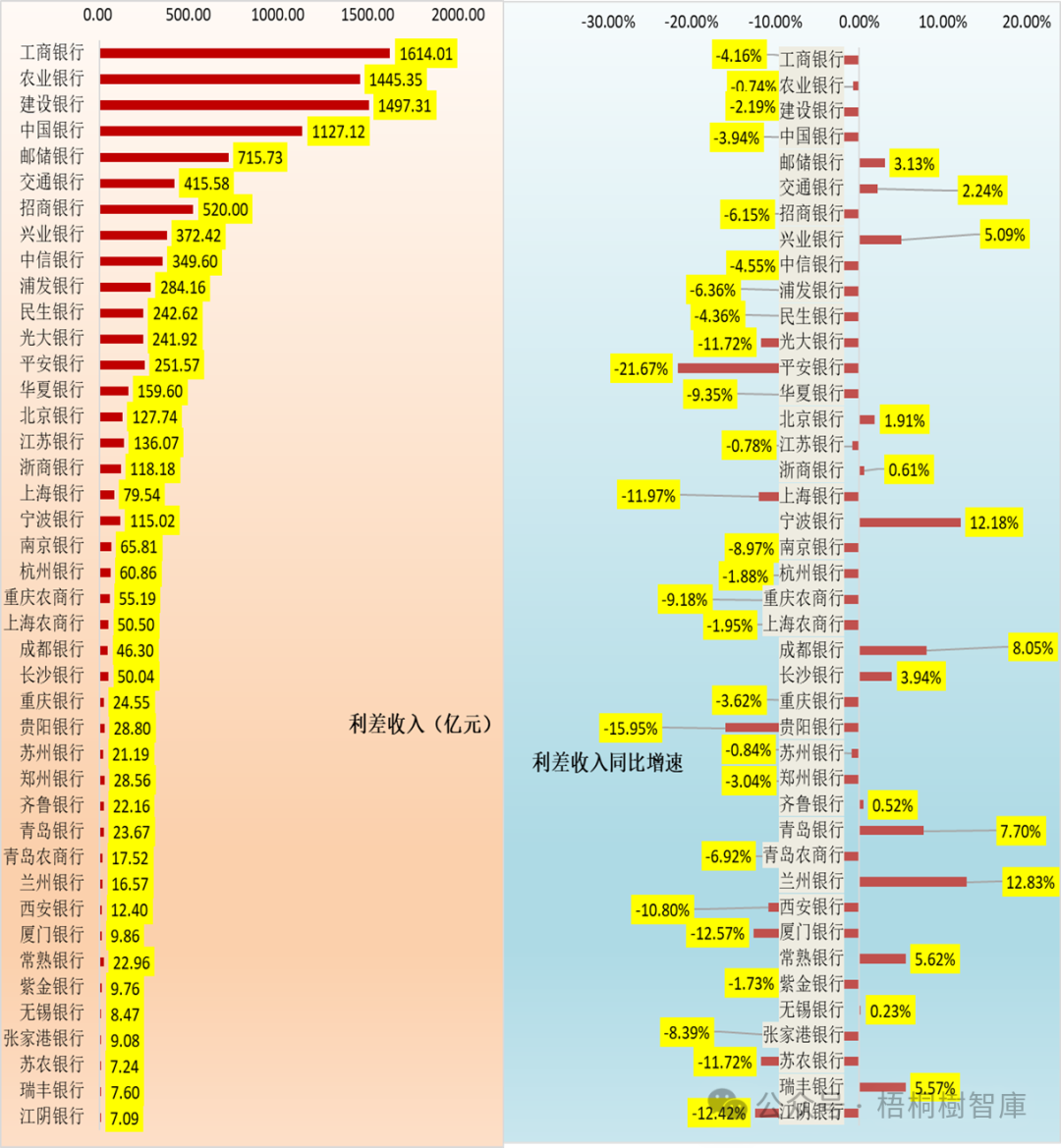 (二)相较于规模指标,盈利指标的表现分更为明显,如14家银行的营收同比录得负增长、28家银行的利差收入同比录得负增长、29家银行的中收同比录得负增长、11家银行的归母净利润同比录得负增长以及14家银行的拨备前利润同比录得负增长。