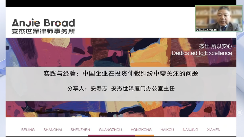 2023年8月10日,由深圳国际仲裁院主办、安杰世泽律师事务所承办的FDI MOOT SHENZHEN Webinars系列第8期“实践与经验:中国企业在投资仲裁纠纷中需关注的要点问题” 研讨会圆满结束。本次研讨会从理论和实践两方面出发,探讨了中国企业在投资仲裁纠纷中需关注的要点问题,在线观看量高达4100余次,获得参会人员一致支持和认可。