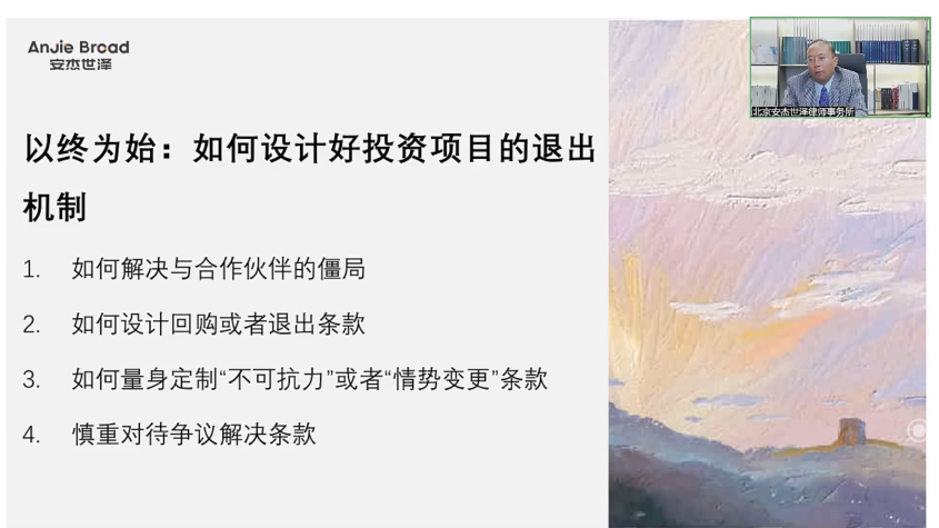 安杰世泽律师事务所合伙人刘洪川律师以“以终为始:如何设计好投资项目的退出机制”为题,从如何解决与合作伙伴的僵局,如何设计回购或者退出条款,何量身定制“不可抗力”或者“情势变更”条款,慎重对待争议解决条款四个方面为大家答疑解惑,获得了一致好评。