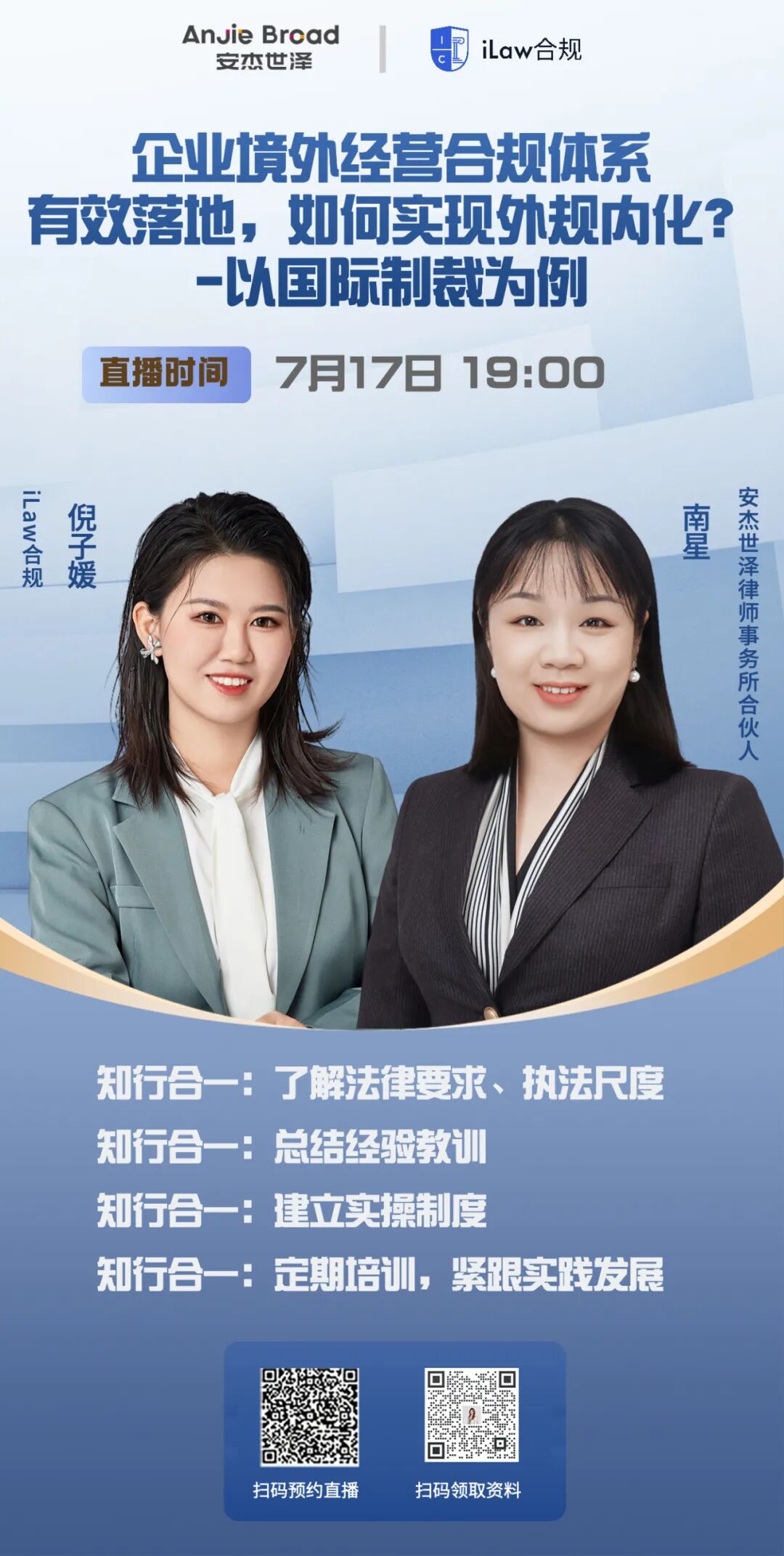 安杰世泽律师事务所合伙人南星律师将携手iLaw,为大家带来企业境外经营合规体系有效落地,如何实现外规内化?—— 以国际制裁为例的专题分享。