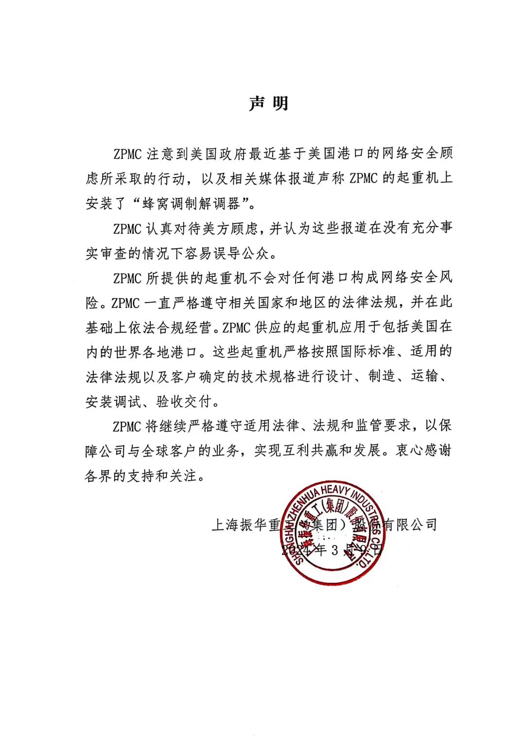 3月9日,大型起重机制造商上海振华重工(ZPMC)在其官网发布声明强调,其所提供的起重机不会对任何港口构成网络安全风险,公司一直严格遵守相关国家和地区的法律法规,并在此基础上依法合规经营。