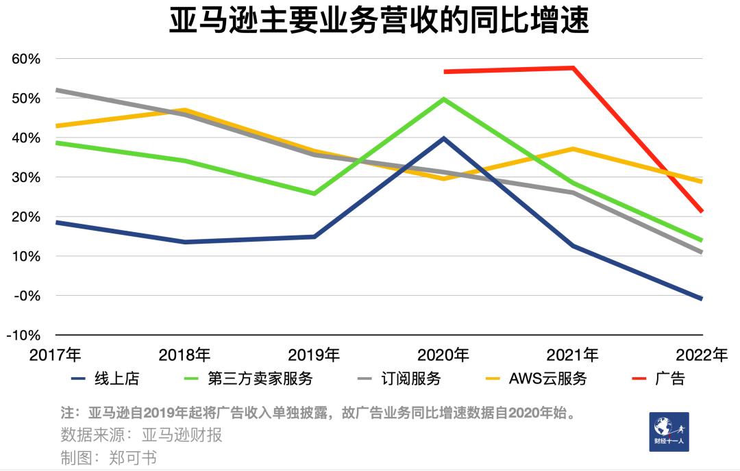 事实上,亚马逊的压力不完全来自对手。2021年,亚马逊电商及相关业务增速开始放缓,线上店营收同比增速从2020年的40%跌至13%、第三方卖家服务营收同比增速从50%跌至28%。2022年,线上店营收同比降低1%,第三方卖家服务营收同比增速仅14%,原本同比增速近60%的广告营收增速放缓至21%。