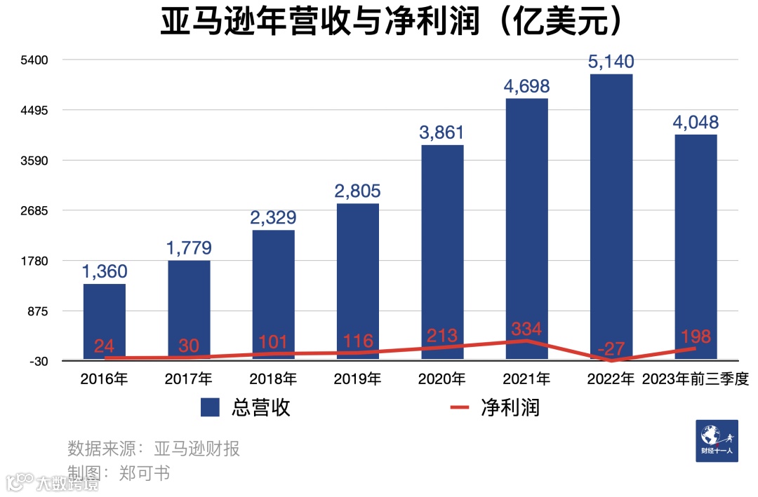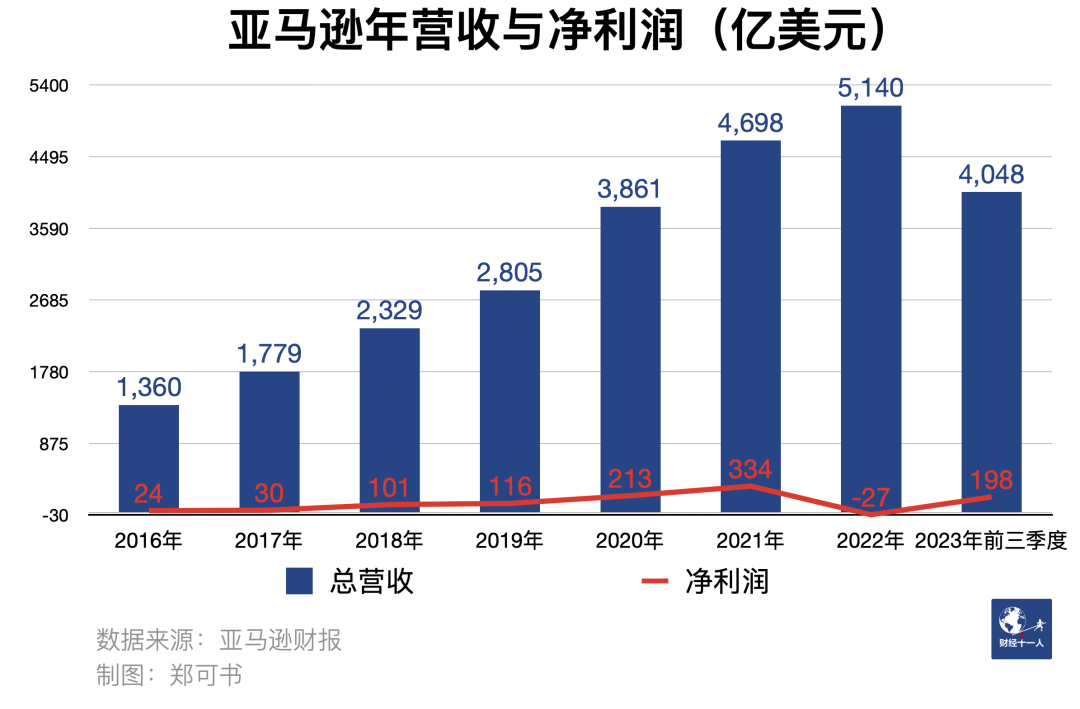 亚马逊的压力不完全来自对手,还来自业绩亏损。“降本增效”之后,亚马逊2023年业绩好转。在2022年糟糕季度全员会上愁眉苦脸的高管们,终于在2023年三季度全员会上轻松地开起玩笑。