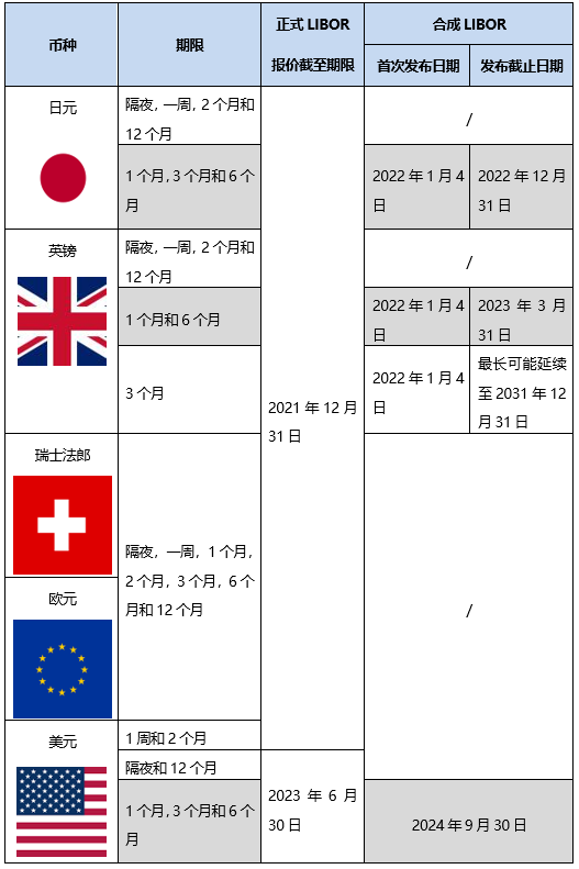 2021年11月,为避免已签订的LIBOR合同的执行混乱,FCA宣布继续发布1个月、3个月和6个月的英镑LIBOR和日元LIBOR,其中1个月、3个月和6个月的日元LIBOR至2022年底停止发布,1个月和6个月的英镑LIBOR于2023年3月底停止发布,3个月的英镑LIBOR预计于2024年3月底停止发布。