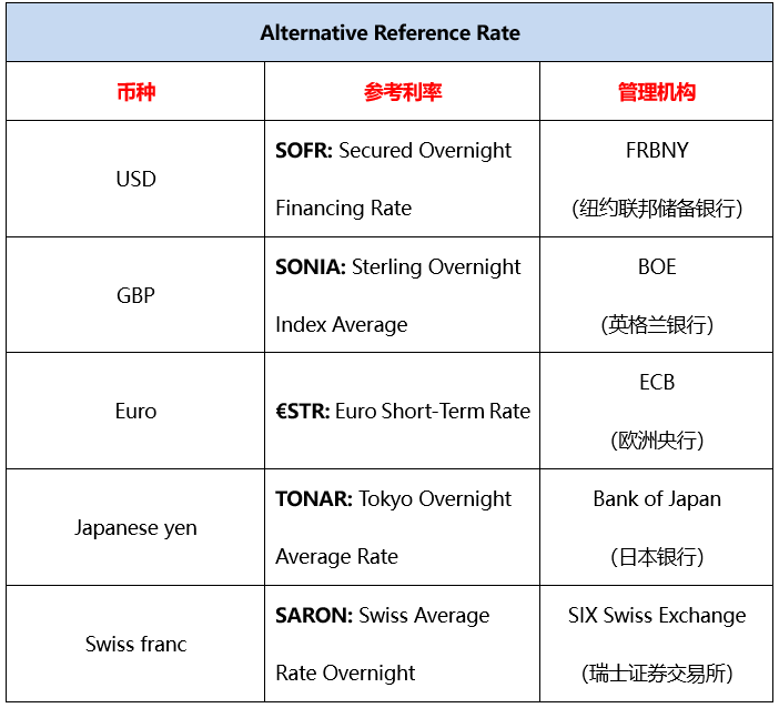 LIBOR逐步停用后,各国金融监管局都针对本国货币的替代利率基准提出了建议,当前五种LIBOR货币的本国监管机构均选择隔夜无风险利率作为其本国货币的首选替代参考利率: