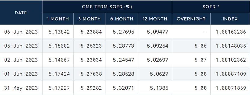 正是由于SOFR与目前贷款合同文件体系的冲突,部分金融机构迟迟未完成存量贷款合同的利率转换。有鉴于此,ARRC于2021年7月正式推荐芝加哥商品交易所期限SOFR(CME Term SOFR Reference Rate,以下简称“Term SOFR”)作为美元LIBOR转换的重要工具。Term SOFR由CME根据SOFR衍生产品市场的隐含市场预期计算,在每个工作日上午五点(美国中央标准时间)发布,分为1个月、3个月、6个月和12个月等四种期限。但应注意的是,芝商所官网发布的Term SOFR仅供查阅,如需在贷款合同中使用该等利率作为参考利率,还需及时与芝商所签署许可协议,避免侵权风险。