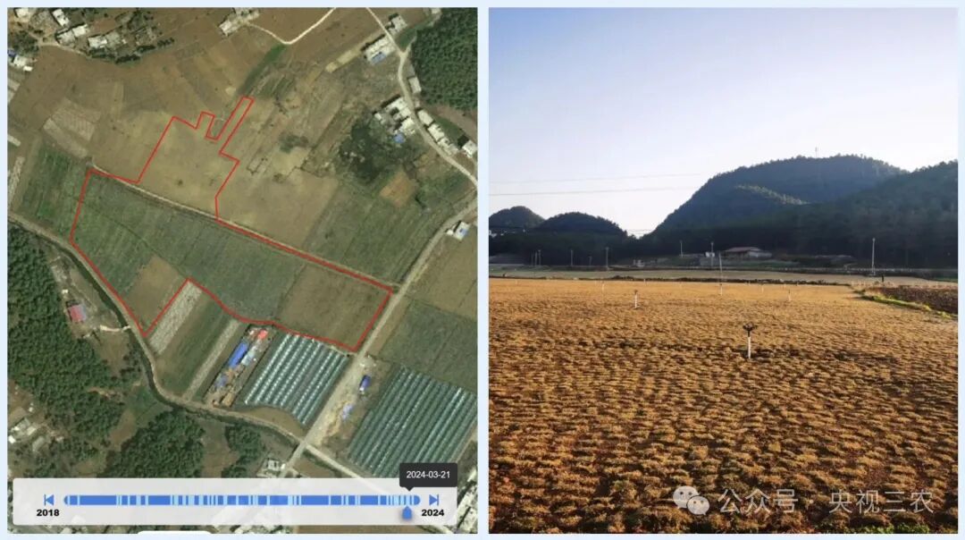 桃花源家庭农场耕地卫星影像(左)实地照片(右)