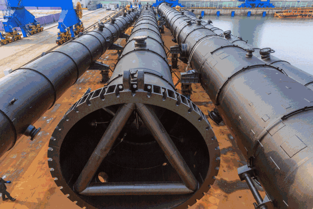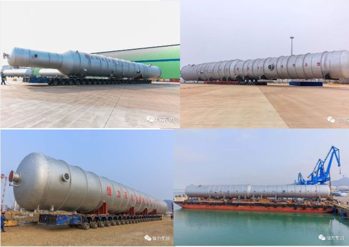 2月20日,柴油加氢裂化装置石脑油稳定塔运至炼化现场(左上)。2月19日,1#芳烃二甲苯塔运至炼化现场,该塔直径最大处达10.6米,高113米,净重1950吨,是恒力炼化项目重量最大,高度最高的塔器设备(右上)。2月18日,柴油加氢裂化装置石脑油分馏塔到货(左下)。2月18日,1#芳烃二甲苯塔码头到货(右下)。