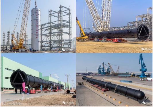 2月23日,2#芳烃歧化进料缓冲罐(左上)吊装完成。2月22日,煤制氢甲醇洗涤塔(右上)运至炼化现场。2月20日、21日,煤制氢甲醇一号洗涤塔(左下)、二号洗涤塔(右下)分别运送至炼化现场。