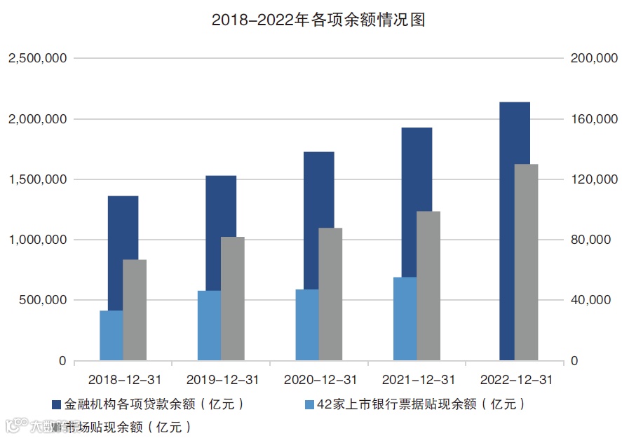 在严监管的环境下,商业银行偏向于提供低风险、期限短的信贷业务,尤其是银票贴现具有信用增级的先天优势,成为各家银行竞争的重要战场。从全市场数据来看,2018-2022年,贴现余额依次为6.68万亿、8.18万亿、8.78万亿、9.88万亿、12.81万亿,年均增速超20%,在信贷余额中的占比从4.90%提高至5.99%,凭借票据属性优势已然成为支撑信贷增长的主力军之一。按wind行业类-商业银行分类统计年报数据可知,42家上市商业银行票据贴现余额从2018年3.3万亿增至2022年8.1万亿,占票据市场总量约63%,年均增幅达36.58%,较全市场贴现余额同期年均增速高13.6个百分点,商业银行票据支持实体经济发展显著发力。