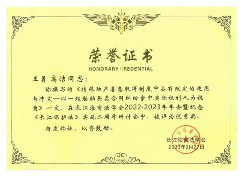 长江海商法学会是中华人民共和国司法部主管,并由中国法学会业务主管的全国性社团法人组织。本次年会议程包括学会年会事宜、主题报告、专题研讨和调研座谈,重点讨论长江高质量发展的司法体制机制、司法协作、环境资源保护、矛盾纠纷解决机制等问题。闭幕式上,长江海商法学会副会长兼秘书长侯振坤宣布了本次年会征集论文获奖名单。北京安杰世泽(南京)律师事务所王勇、高洁律师撰写的《特殊动产善意取得制度中占有改定的适用与冲突——以一起船舶买卖合同纠纷案中的实际权利人视角》荣获优秀奖。
