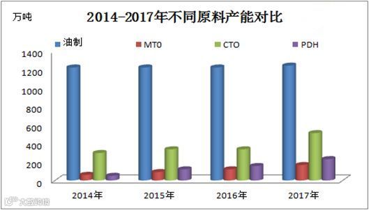由不同原料产能对比图可发现,PDH增速是最为快速的品种,2017年较2014年增加180万吨,增速150%,其中煤制烯烃较2014年增加215万吨,增速64%;甲醇制烯烃系列增加106万吨,增速117%。