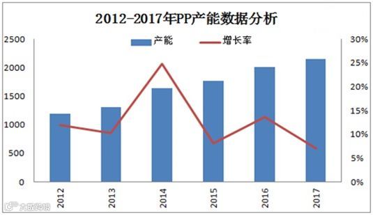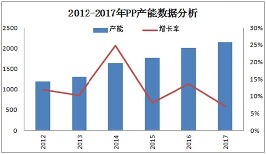 由上图可知,2017年聚丙烯的产能继续增长而增长率相比较与前几年有所下降,但是总体维持在5%以上。近五年产能集中的时间点有两个,分别是2014年下半年和2016年,之所以说这两年出现扩能高峰,是因为2014年下半年扩能325万吨,2016年扩能270万吨,分别是扩能增速为25%、14%。