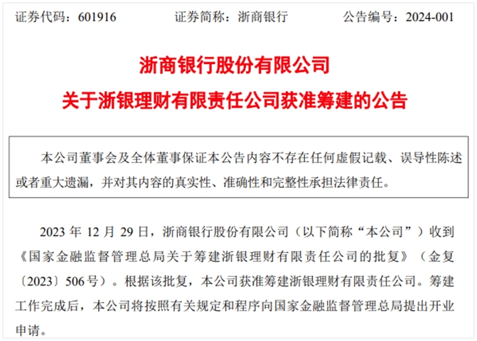 1月1日,浙商银行发布公告称,其已经收到相关批复,获准筹建浙银理财有限责任公司(下称“浙银理财”)。