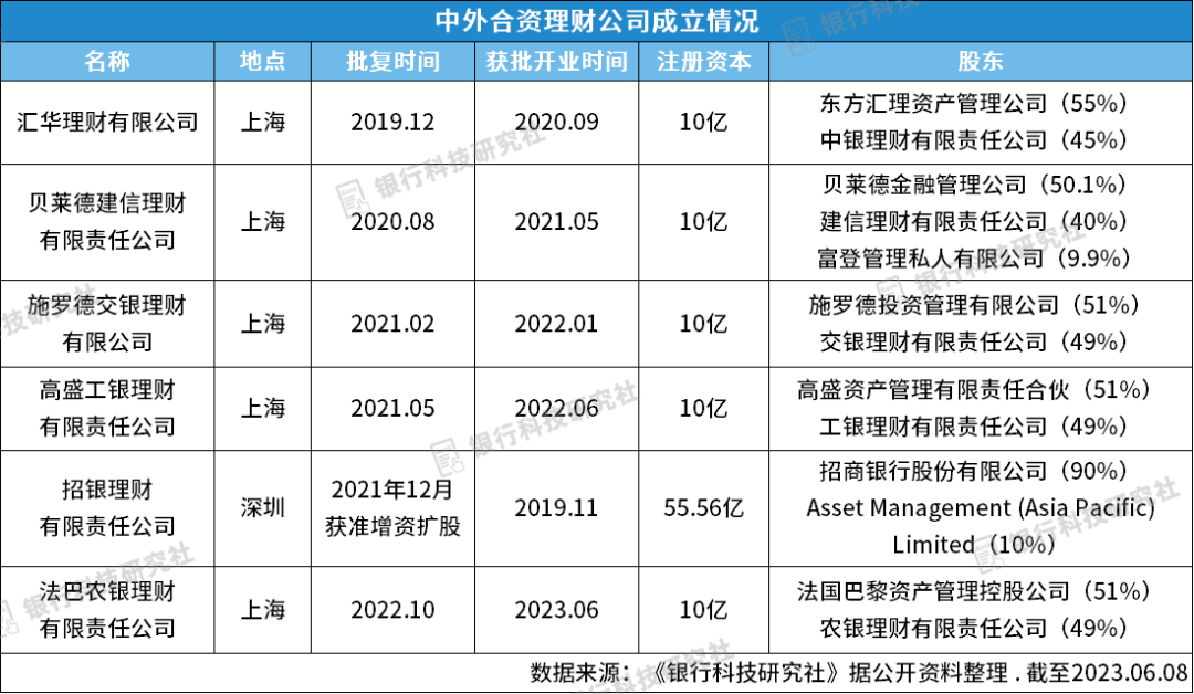 除此之外,中银理财、建信理财、交银理财、工银理财、农银理财已经先后设立了旗下中外合资理财子公司,招银理财也通过增资扩股引入外资股东,银行系理财子公司的规模进一步扩大。其中,农银理财参股的“法巴农银理财”2023年6月开业。