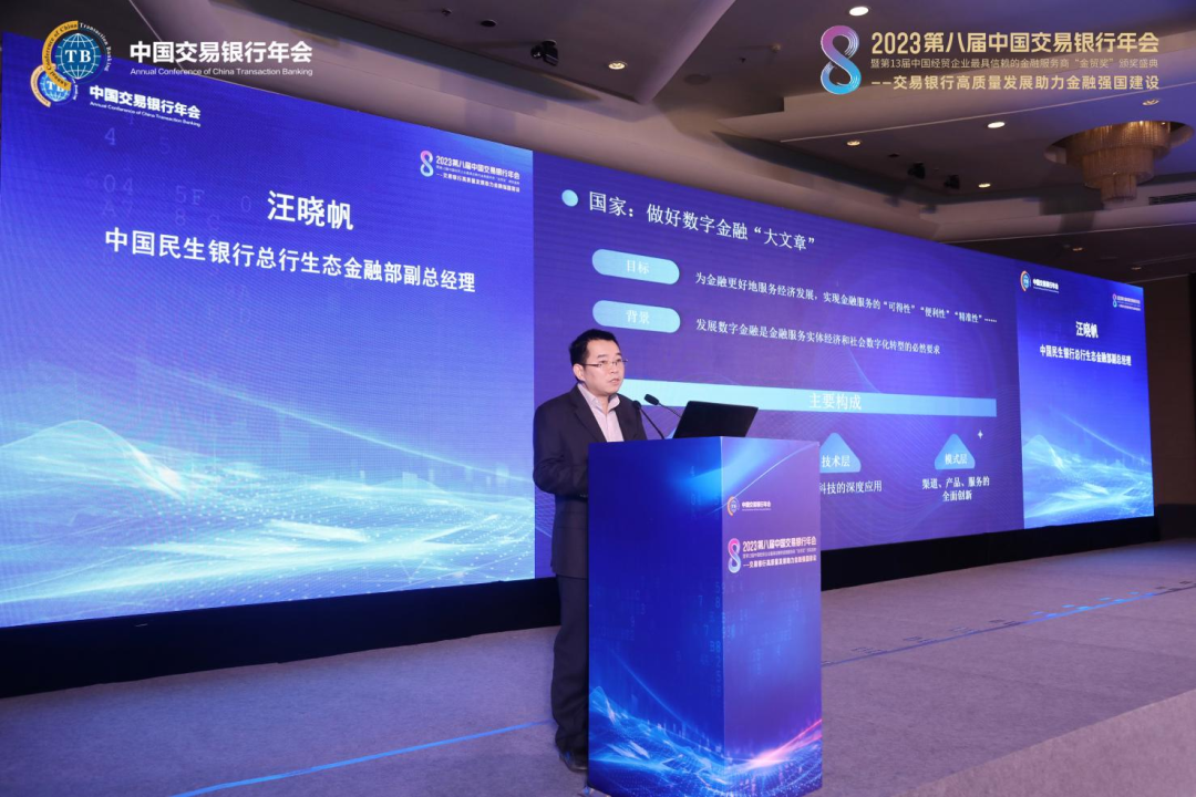 12月15日,第八届中国交易银行年会暨第十三届中国经贸企业最具信赖的金融服务商评选“金贸奖”颁奖典礼在北京隆重召开。中国民生银行总行生态金融部副总经理汪晓帆以“加强生态金融协作 促进数字金融发展”为主题,在大会上发表了精彩演讲。