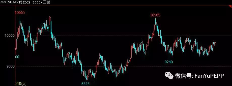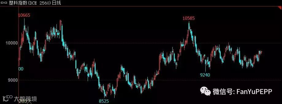 从9月5号开始进入了一波长期下跌,那个时候没有人看衰宏观,但是当时应该是整个交割的压力,因为大家都觉得9月的仓单会比较大,9月5号、9月6号仓单都已经出来了,整个聚烯烃的仓单跟其他的品种不一样,生成仓单的速度很快,可以先把质检那些做完,但是最后交割仓库不让你去点,到最后点掉就好了,跌到后面最低点9240,现在已经走了两个M,这是截止昨天的图,如果今天上去9900,明天后天再下来,相当于走了连续三个M的图形,其实这一波我们就归为就是一个横盘整理,上面有顶,9900到1万,下面底部在9400左右,这是目前的情况。