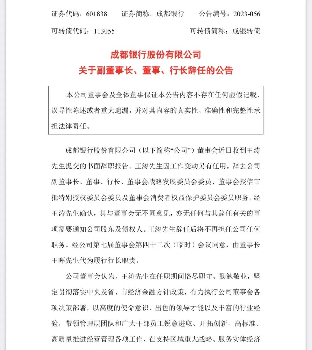 11月28日晚间,成都银行公告称,董事会近日收到王涛提交的书面辞职报告。王涛因工作变动另有任用,辞去公司副董事长、董事、行长、董事会战略发展委员会委员、董事会授信审批特别授权委员会委员及董事会消费者权益保护委员会委员职务。