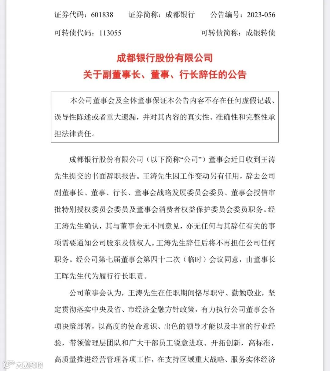 此前,据今年11月初消息,四川省委组织部发布干部任前公示显示,现任成都银行党委副书记、副董事长、行长王涛拟任省管企业正职。