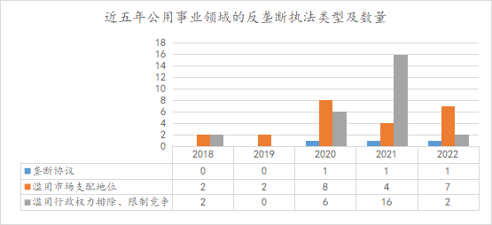 以下图表总结了近年来公用事业领域的反垄断执法案件情况。从图表可以看出,公用事业领域是垄断行为频发的高风险领域,且垄断行为也呈现多样化的特点。