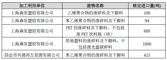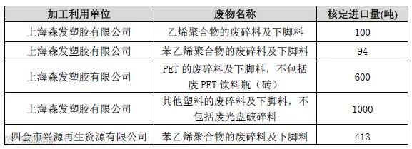 2月22日,环保部固管中心公示了2018年第7批建议批准的限制进口类申请明细表。其中2家废塑料加工利用企业获得批文,核定进口量2207吨;