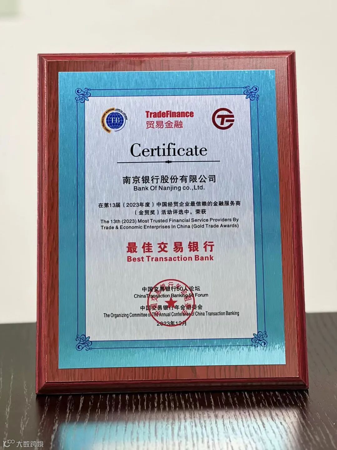 近日,第13届中国经贸企业最信赖的金融服务商(金贸奖)评选结果揭晓,南京银行荣获“最佳交易银行”奖项,体现了市场和业内对南京银行交易银行的高度认可。