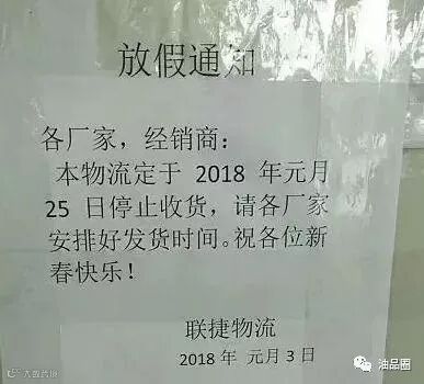 与往年不同的是,今年物流放假时间相比去年足足提前了十天左右。据了解,往年物流公司一般是在农历腊月二十左右开始放假,但是今年情况有所不同,前段时间突如其来的暴风雪袭击,特别是北方地区,给物流运输带来诸多不便,加上油价等物流成本的影响,即便在非常繁忙的时段,不少物流公司不得不陆续提前发布了春节停运通知。