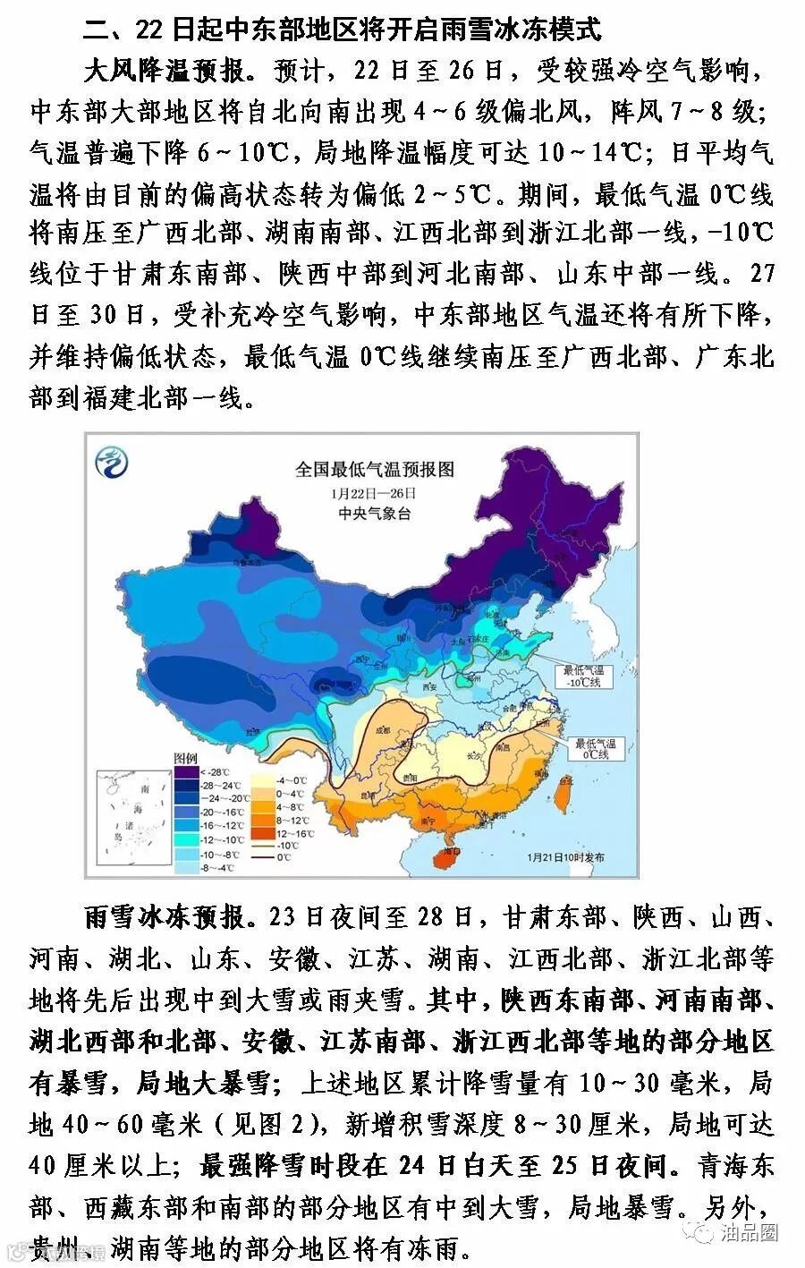 又一波大雪,抓紧备货!防寒防冻,特别柴油,别让“香火”断了线! 23日夜间至28日,甘肃东部、陕西、山西、河南、湖北、山东、安徽、江苏、湖南、江西北部、浙江北部等地将先后出现中到大雪或雨夹雪。其中,陕西东南部、河南南部、湖北西部和北部、安徽、江苏南部、浙江西北部等地的部分地区有暴雪,局地大暴雪;上述地区累计雨雪量有1030毫米,局地4060毫米,新增积雪深度830厘米,局地可达40厘米以上;最强降雪时段在24日白天至25日夜间。青海东部、西藏东部和南部的部分地区有中到大雪,局地暴雪。另外,贵州、湖南等地的部分地区将有冻雨。看到后营运时提前了解天气情况,合理安排营运时间,并提前准备好防寒、防冻、防滑措施。