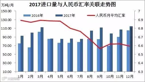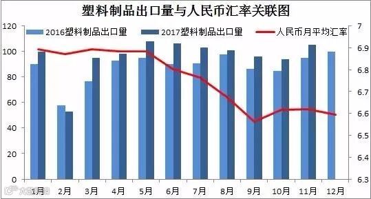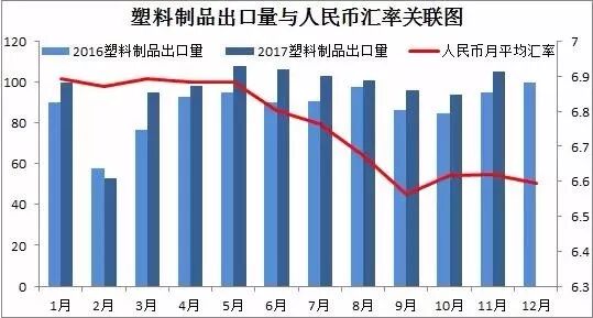 汇率和塑料出口量同比变化对比来看,从同比变化幅度来看,汇率变化相对平稳对塑料出口影响相对比较小的,除了汇率之外,国外需求仍然是出口的主要影响因素。在2017年人民币升值过程里面,塑料制品出口仍然保持一定的增长。在外围环境较好的情况之下,出口影响并不显著,从月份对比看,2016年和2017年相比,特别是下半年数月里,每个月出口都是在增加的过程,并没有受到人民币升值的影响。塑料制品涨幅,与汇率变化也一定的相关,但是成本和供需还是主要因素的。