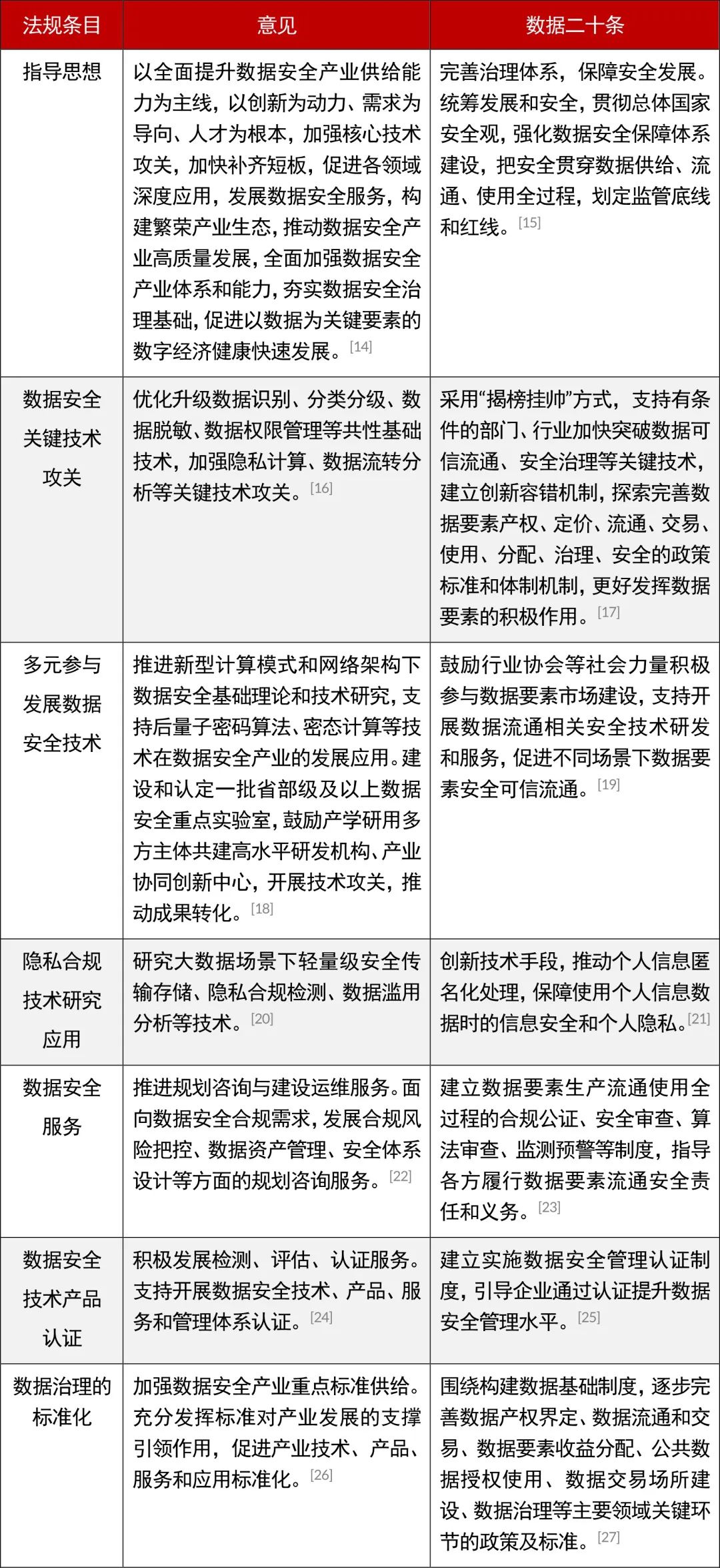 在保障数据安全和促进数据安全产业方面,《意见》与“数据二十条”具有相通承接的理念,我们在此列举如下部分条款以示例: